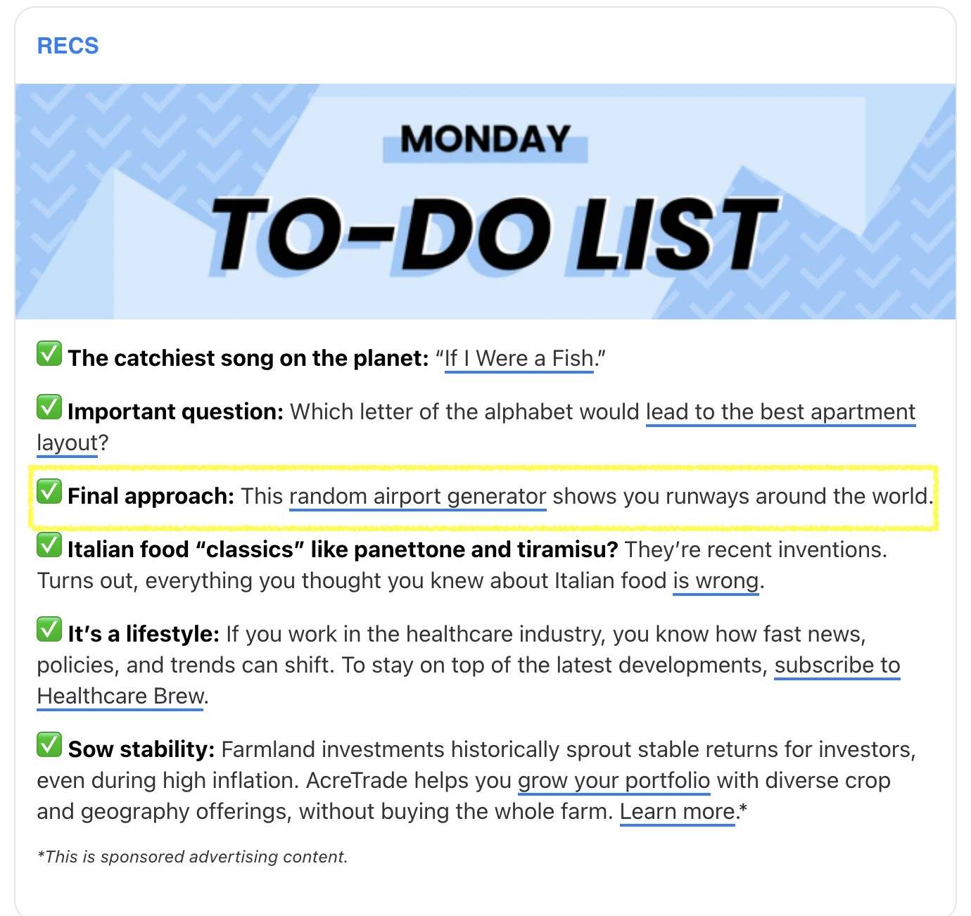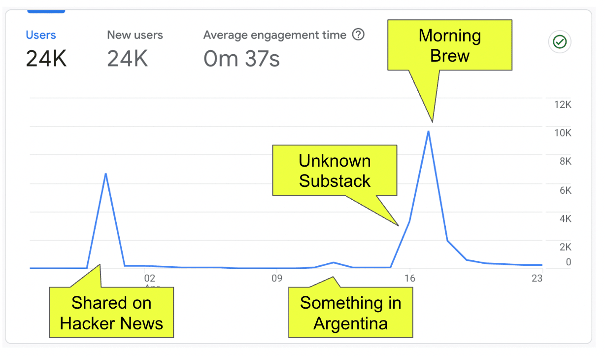 TLDR: RandomAirport reached 24,000 visitors in 28 days. 2 weeks ago, on Wednesday evening April 12, I open my RandomAirport Google Analytics, to show my spouse how it works. To my astonishment, I had 29 users in last 30 minutes. That is a lot more than the 3 or 4 I had on average since the two weeks I launched on Hackernews. Traffic was coming mostly from Argentina. The funny thing is, I don't know where it came from, and I'll probably never find out. It seems the main channel was email, but which email? Then, four days later, Sunday evening April 16, another burst of traffic. 155 users in last 30 minutes. This time, the source was Substack. (it took a lot of digging in the Google Console to figure this out). I Googled if I could find the newsletter. I checked Substack's search function. I submitted a ticket to Substack But still, I don't know which newsletter mentioned my website. (Substack replied after two weeks asking if I still wanted this ticket to be solved. I said "yes"). It triggered my vanity, I wanted to know who was talking about my website. Then on Monday April 17, the floodgates really opened. RandomAirport got featured in Morning Brew, a newsletter with 6 million subscribers according to Google. Traffic starts really jumping: At this point, I'm feeling excitement, anxiety and proudness in a weird mix. It's also causing a type of stress. A kind of "responsibility" to make sure these visitors have a good experience. But there is not much I can do to impact their experience, except hoping the site doesn't go down. And adding a feedback form. Capture the feedback while it's hot! I remain in this state of high excitement until Wednesday morning. Then the traffic falls back to a handful of users per 30 minutes. I can breath again. I just realise my hobby project had 24,000 visitors in one month ... ActionsThe feedback form keeps collecting ideas. I start steadily working through them. I built my app pretty haphazard, and it does 2 API calls to Google Maps while it should need only one. Due to that, I again am incurring costs, but not 1,200 USD like last month, but 12 USD up to now. I'm keeping adding airports. I'm also trying to enable keyboard controls (though not working on Safari yet somehow). It now doesn't show duplicates anymore. And I want to hide the map. The rest is backend work Side-note 1Overnight, I got an email from Google Cloud again. Having incurred 1,200 USD in costs on my previous peak, I was afraid something went wrong again. On the contrary, it was a message telling me they'll reimburse me for that previous incident. Every Google Cloud email still makes my heart jump a little. Side-note 2I also almost bumped into the daily quota I've set for myself after that previous costly incident. Fulminating about Google again: once again no warning emails when I almost reached it :( Luckily I didn't! Side-note 3It's great to document these things on Twitter so I can easily write a newsletter about it later! |